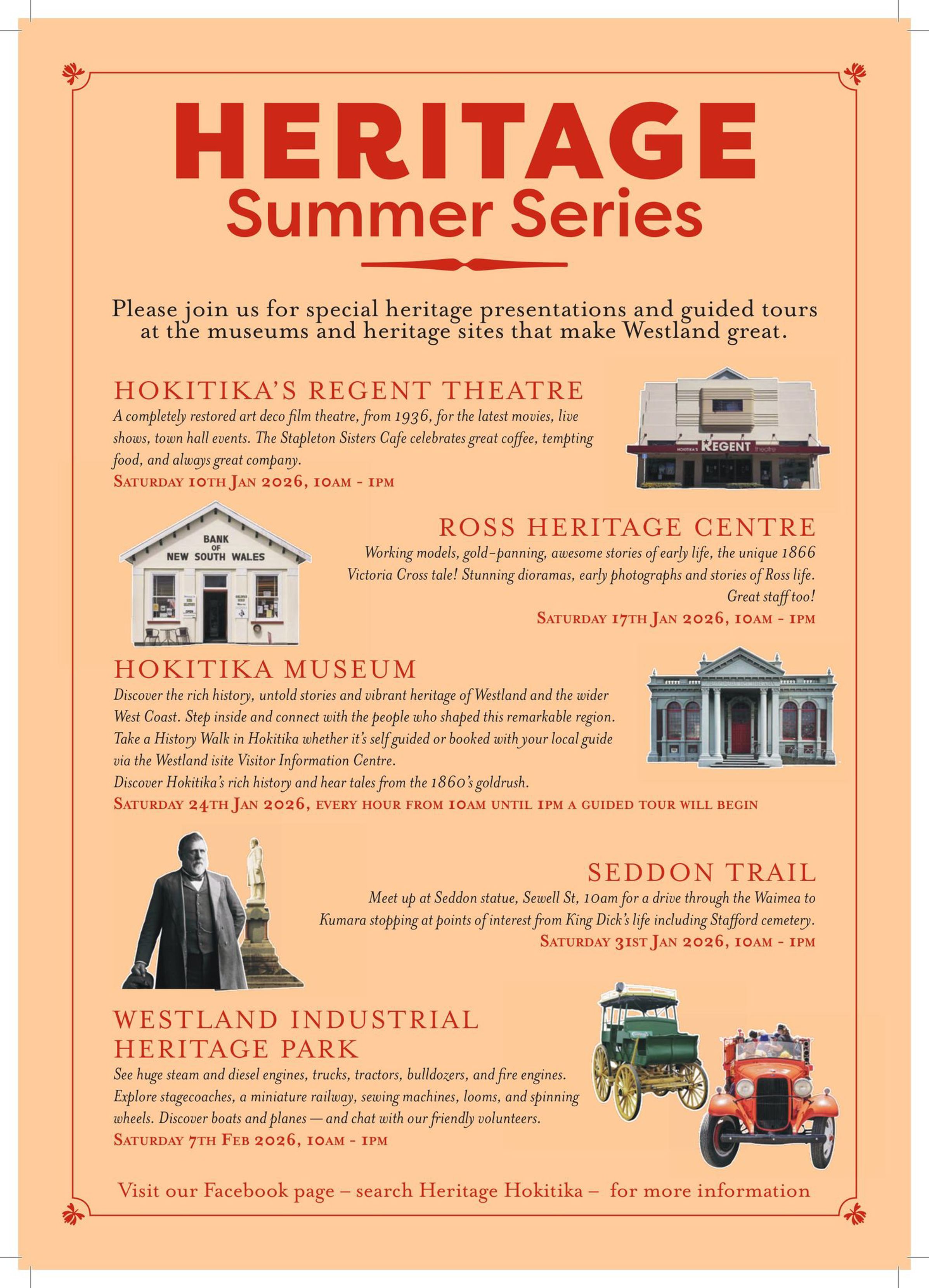 Join in for special heritage presentations and guided tours at the museums and heritage sites that make Westland great.